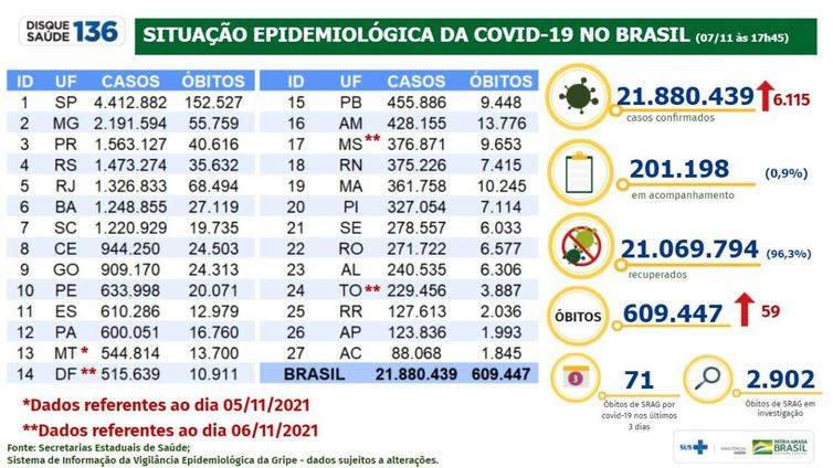 Em 24 horas, as autoridades de saúde notificaram 59 novos óbitos pelo novo coronavírus, totalizando 609.447. Ontem, o painel de informações marcava 609.388 mortes acumuladas.