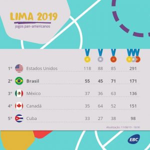 Na edição 2019 dos Jogos Pan-Americanos, realizados de Lima, no Peru, a equipe brasileira confirmou a melhor atuação do país em Jogos Pan-Americanos. O Time Brasil conquistou 171 medalhas e garantiu o país no 2º lugar do quadro geral de medalhas, com 55 de ouro, 45 de prata e 71 de bronze.