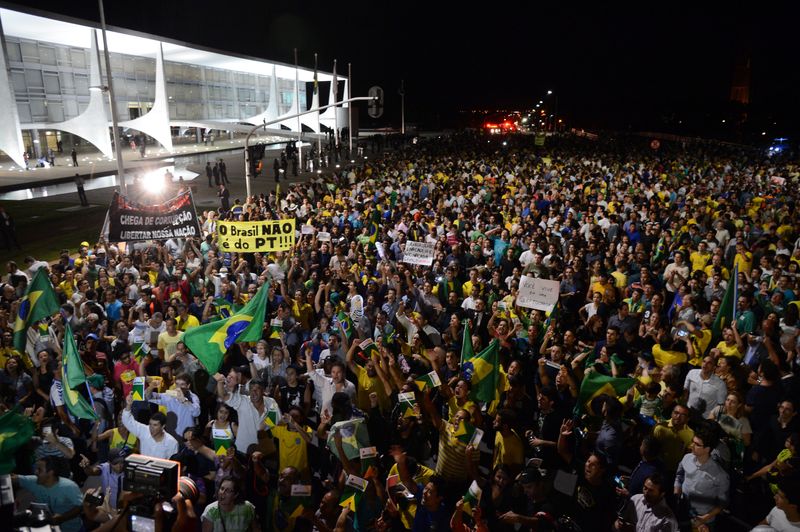 Pelas redes sociais, diversas postagens convidavam quem estivesse insatisfeito a participar da manifestação onde estivesse, batendo panelas ou buzinando. As manifestações também seguem nas ruas. Em Brasília, de acordo com a Polícia Militar do Distrito Federal (PMDF), cinco mil pessoas se concentraram em frente ao Palácio do Planalto. Elas foram motivadas por parlamentares oposicionistas e convocações nas redes sociais. A Polícia Militar reforçou a segurança na rua que dá acesso ao Palácio da Alvorada, residência oficial de Dilma.