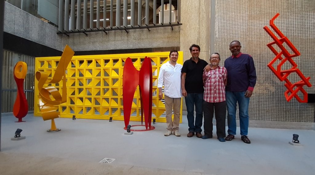Por fim, Rogério Reis pensou em uma escultura solar e contou com a coincidência de sua obra somas todas as cores das demais. “Aqui é um lugar aberto, e a peça tem cores de matizes quentes, como laranja, amarelo e vermelho. E casou bem porque cada um fez uma cor destas, e a minha obra ficou sintetizando isso”, avaliou.