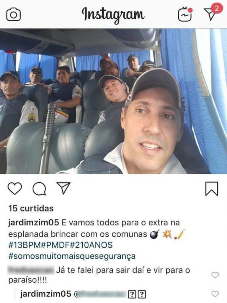 Pouco antes do protesto na Esplanada dos Ministérios o policial militar, identificado como Rodrigo Jardim, fez uma postagem em uma rede social na qual afirma: “E vamos todos para o extra na Esplanada brincar com os comunas”.