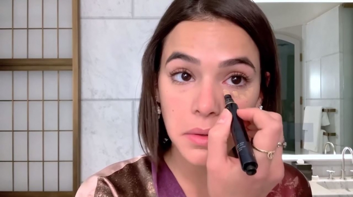 No tutorial de maquiagem, Bruna ensina em inglês como ter o “brilho brasileiro no inverno”. “Vou ensinar minha maquiagem de todos os dias”, diz a atriz mostrando que entre os produtos que fazem parte de sua rotina está o óleo facial.