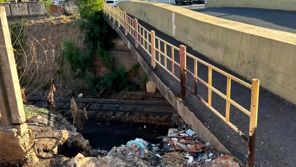 Buraco e esgoto ameaçam trecho de estrutura de linha ferroviária