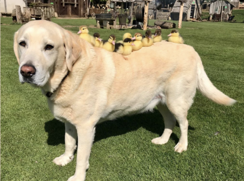Os patinhos foram encontrados por funcionários do castelo Mountfitchet. O labrador passou a cuidar deles a tal ponto que se tornaram inseparáveis – eles chegam até a dormir na mesma cama.