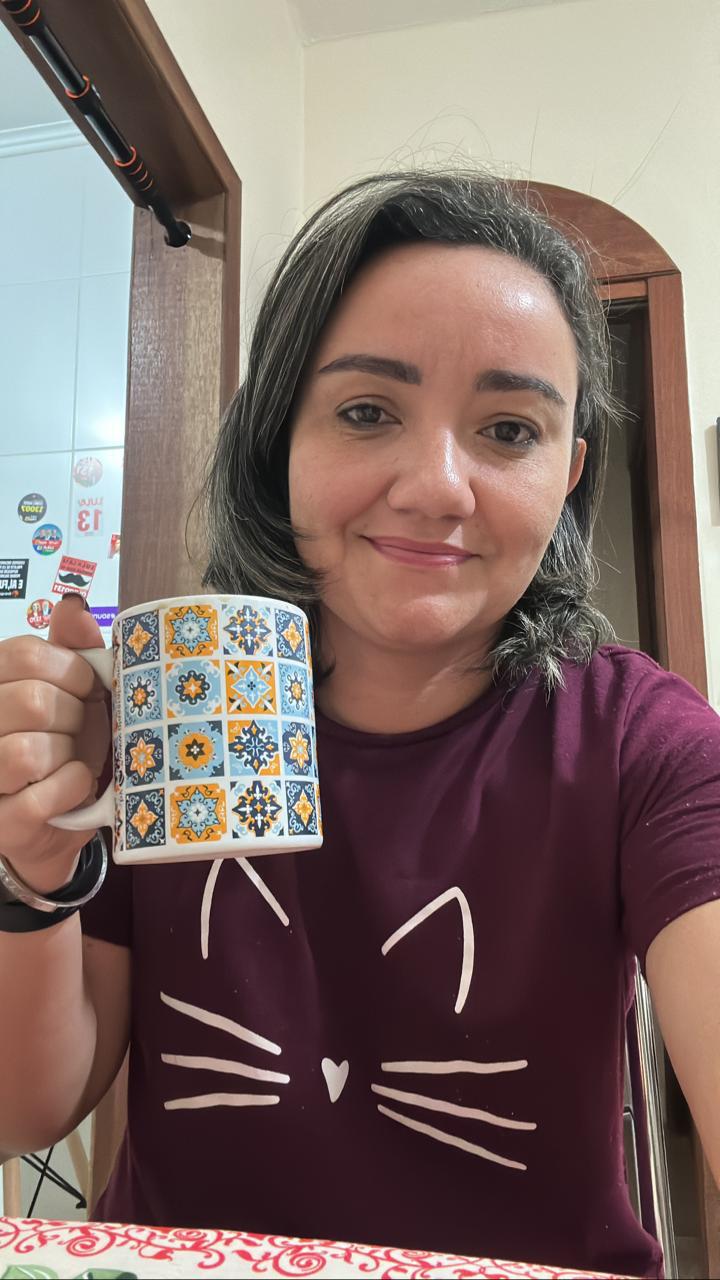 Mais alguns minutos, lá está a minha mulher sentada à mesa. O lindo rosto, apesar de parecer ser de poucos amigos a essa hora da manhã, ainda esboça um “Obrigadinha!”. Rapidamente, ela ergue a caneca quase cheia, que toca seus lábios.