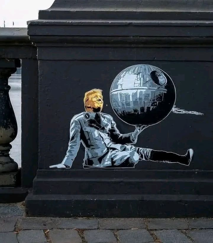 *Foto: Trump brincando com o poder/mundo (montagem IA fusão dos filmes “Tempos Modernos”, Charlie Chaplin e “Guerra nas Estrelas”, George Lucas.