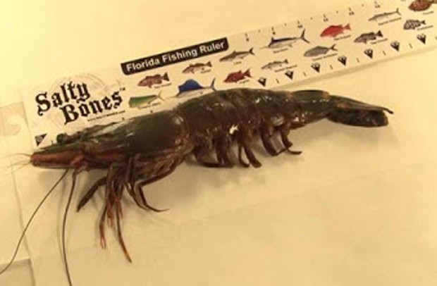 O camarão-tigre-grande encontrado no rio St. Johns tinha 30,5 centímetros de comprimento. Eles são agressivos, são comedores de carne e devoram outras espécies de camarão”, disse Robin Emmett.