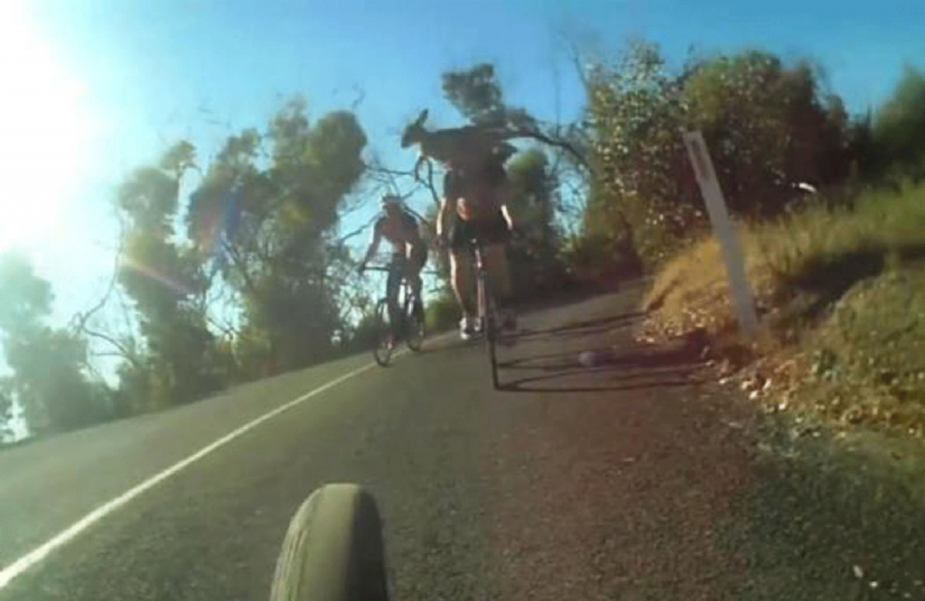 Um ciclista que competia na Austrália foi “atropelado” por um canguru, e o choque arrancou seu capacete.