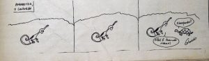 Pois bem, eu me desviei da dita cuja e entrei bem rapidinho na pista, quando veio um ônibus e quase me atropelou. Tomei um susto daqueles, mas logo comecei a rir sozinho, enquanto as pessoas me olhavam, talvez imaginando que eu fosse louco. Foi naquele exato momento que tive a ideia do primeiro quadrinho do Adamastor.
