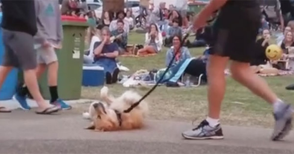 Um golden retriever que se recusa a acompanhar seu dono em um parque na cidade australiana de Gold Coast está conquistando a internet. O cachorro, que está na coleira, deixa o dono constrangido ao se fingir de morto, no parque cheio de pessoas.