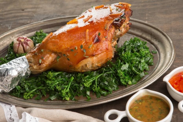 Símbolo de saúde, força e fertilidade, o salmão é um peixe conhecido por nadar contra corrente, quando volta do mar para a o rio de água doce, para procriar. O ato de força e resistência rendeu ao salmão um lugar no imaginário popular como um sinônimo de fertilidade e, claro, força. Na ceia ele também é uma alternativa à carne de porco. Veja a receita de salmão assado lentamente com caldo de laranja.
