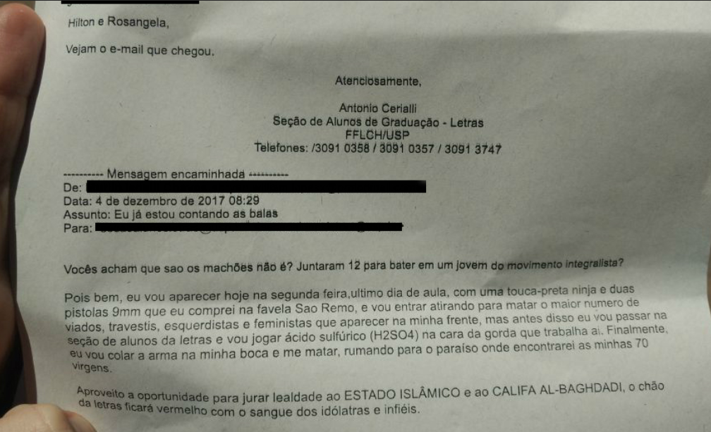 Uma carta de um suposto aluno, carregada de ameaças, chegou no final da manhã deste segunda-feira, dia 4, à Faculdade de Filosofia da USP. E até o meio desta tarde, a direção, indagada pela coluna, não havia decidido o que fazer.