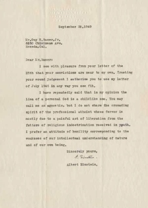 Mas é uma carta na qual ele fala sobre a existência de Deus que deve atrair mais a atenção de colecionadores. Nos anos 1940, Einstein trocou correspondências com um homem chamado Guy Raner Jr, residente na Califórnia, sobre o assunto. Na carta, ele diz: “Eu já disse repetidamente que na minha opinião a ideia de um Deus pessoal é infantil”. “Talvez você me chame de agnóstico, mas eu não compartilho o espírito de um ateísta profissional… Prefiro uma atitude de humildade que corresponda à fraqueza de nossa compreensão intelectual da natureza e de nós mesmos.”