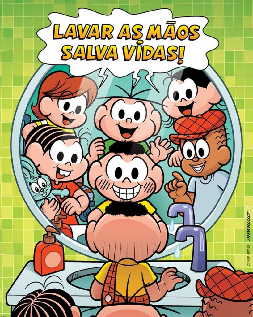 Avesso a água, o personagem Cascão, dos quadrinhos de Mauricio de Sousa, vai lavar as mãos no combate ao coronavírus com o objetivo de passar uma mensagem positiva e alertar sobre a importância da higiene pessoal no combate à disseminação do vírus. Cascão é conhecido por não gostar de tomar banho e estar sempre “sujinho”. Além de lavar as mãos, Cascão também também começou a tomar banho e encomendou até sabonetes.