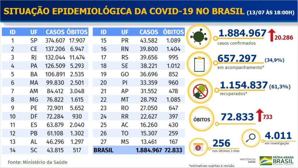 Com os novos dados o Brasil soma 1.884.967 casos confirmados e 72.833 mortes decorrentes da doença. O Ministério da Saúde estima que 61,3% dos infectados tenham se recuperado, o que representa 1.154.837 casos.