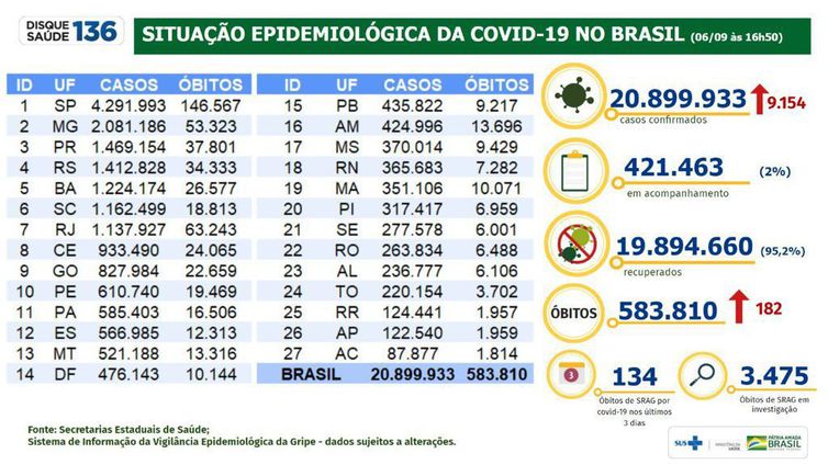 A soma de pessoas infectadas pelo novo coronavírus desde início da pandemia alcançou 20.899.933. Em 24 horas, as secretarias de saúde confirmaram 9.154 pessoas infectadas com o vírus. Na véspera, a soma de casos acumulados no sistema de informações do Ministério da Saúde estava em 20.890.779.