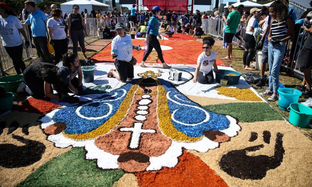 A festa de Corpus Christi na Esplanada dos Ministérios, organizada pela Arquidiocese de Brasília, foi iniciada às 6h, desta quinta-feira (8), com a confecção do tapete colorido com temática religiosa que celebra a data.