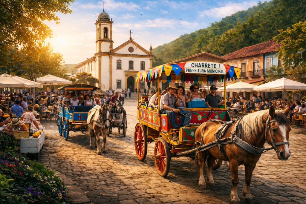 Inaugurou-se o serviço na praça da cidade em dia de domingo, com festa e bandinha de música. Cada nova charrete ganhou uma plaqueta com identificação, os números 1, 2 e 3, com os dizeres: “Prefeitura Municipal” e “Charrete Autorizada”. Se a vocação turística do lugar vingasse, e os turistas chegassem em bom número, o prefeito iria autorizar mais charreteiros, mas Manoel Santo, Olavo e Bilu ficariam com o pioneirismo.