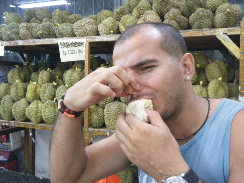 Durião é uma fruta tropical conhecida pelo seu cheiro forte. É comumente banido dos quartos de hotel e dos transportes públicos em todo o sudeste da Ásia, e se assemelha muito a uma pequena jaca.