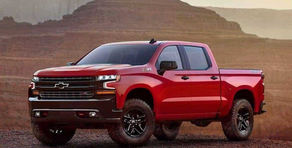 O veículo tem faróis de LED pequenos e bem elevados. As molduras logo abaixo lembram o conjunto ótico atual, mas possuem apenas os repetidores de direção na parte inferior. A grade é inteiramente preta, assim como o logotipo Chevrolet nesta configuração Silverado 1500 LT Trailboss Z71.