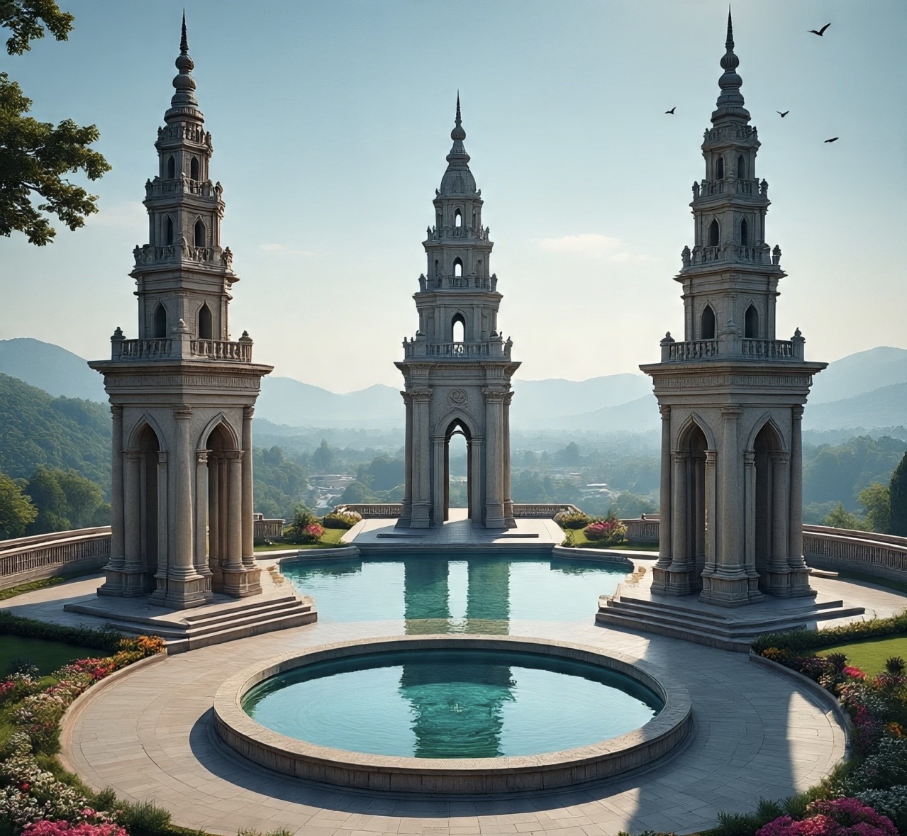 Uma construção circular com quatro torres idênticas, sendo que a torre do leste fica exatamente diante da torre do oeste.