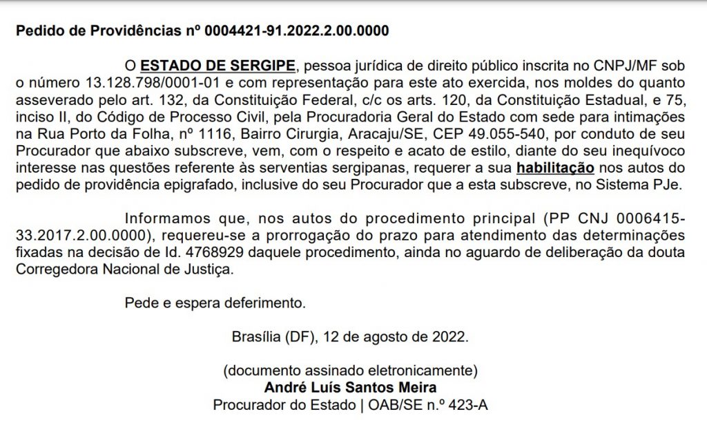 A Corregedoria Nacional de Justiça, notificou o TJ Sergipe e requisitou o envio de diversos documentos, conforme indicado a seguir: