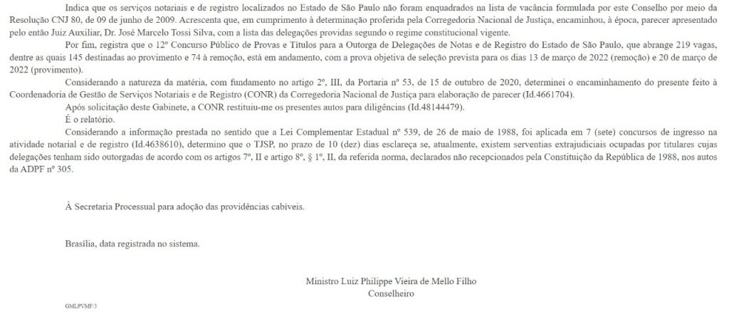“[…]Considerando a informação prestada no sentido que a Lei Complementar Estadual nº 539, de 26 de maio de 1988, foi aplicada em 7 (sete) concursos de ingresso na atividade notarial e de registro (Id.4638610), determino que o TJSP, no prazo de 10 (dez) dias esclareça se, atualmente, existem serventias extrajudiciais ocupadas por titulares cujas delegações tenham sido outorgadas de acordo com os artigos 7º, II e artigo 8º, § 1º, II, da referida norma, declarados não recepcionados pela Constituição da República de 1988, nos autos da ADPF nº 305. À Secretaria Processual para adoção das providências cabíveis. Brasília, data registrada no sistema. Ministro Luiz Philippe Vieira de Mello Filho, Conselheiro”.