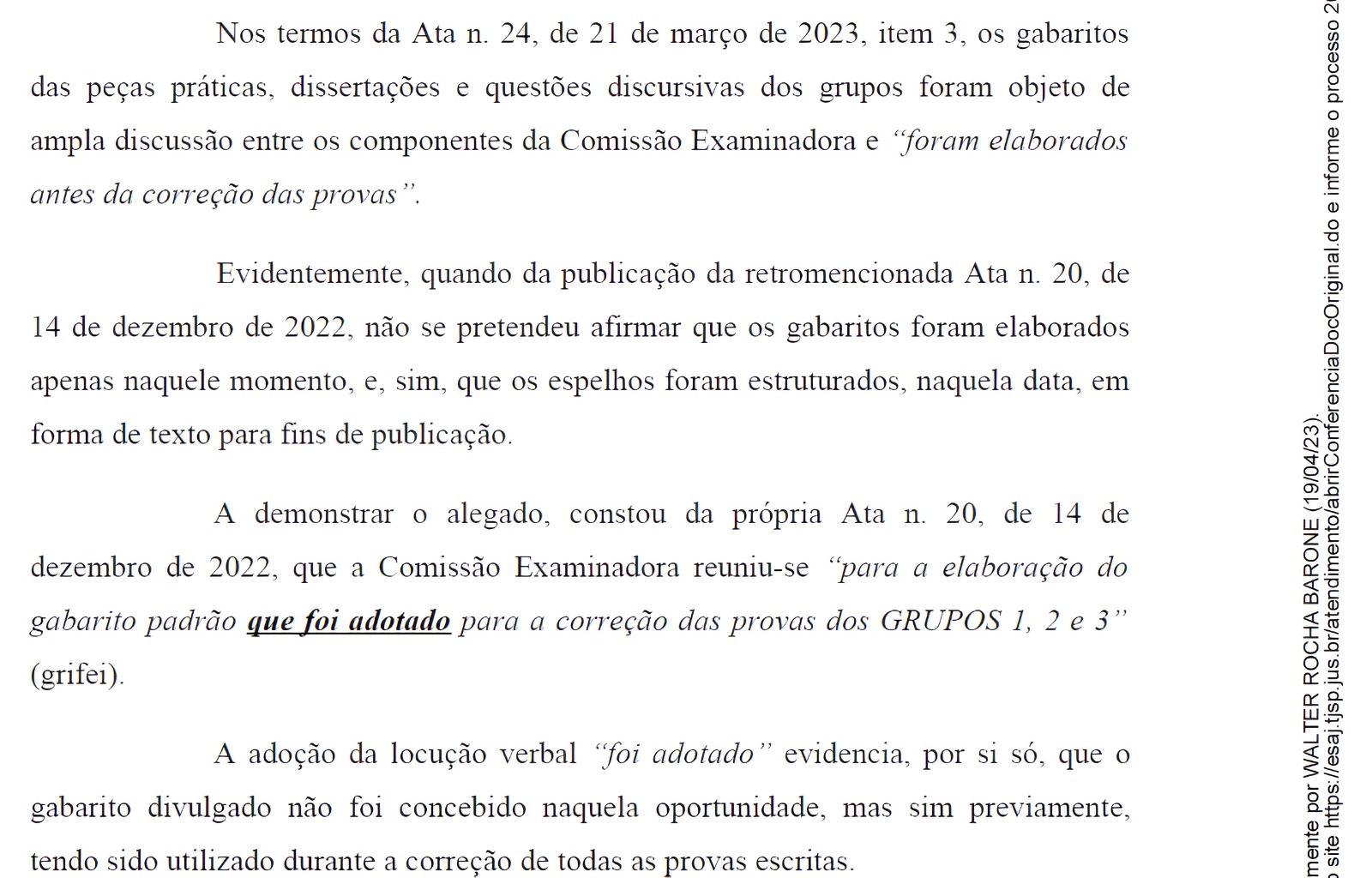No Ofício nº 34/2023 – DEPLAN 1.3 o TJSP vem alegando que os gabaritos foram feitos antes das correções da prova e que esta informação consta da ata 24, de 21.03.2023.