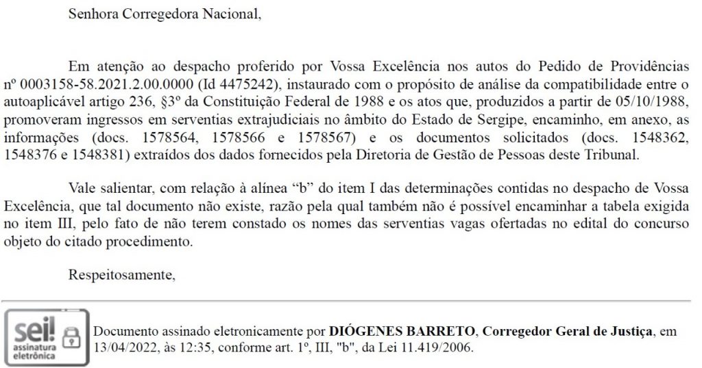 O desembargador Diógenes Barreto enviou informações. mas, segundo vêm analisando diversos especialistas em direito administrativo sancionador, os documentos estão incompletos. Citam, a título de ilustração, a questão do edital em que faltam diversas folhas, inclusive, cronograma de aplicação das provas, fases, se o certame foi de provas e títulos, se houve prorrogação do prazo de validade deferido pelo Pleno do Tribunal e se houve homologação do resultado final.