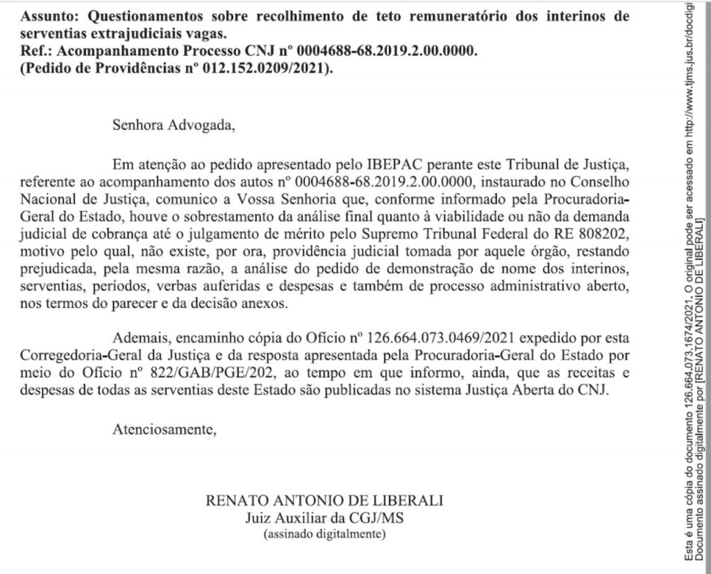 “[…]Em atenção ao pedido apresentado pelo IBEPAC perante este Tribunal de Justiça, referente ao acompanhamento dos autos nº 0004688-68.2019.2.00.0000, instaurado no Conselho Nacional de Justiça, comunico a Vossa Senhoria que, conforme informado pela Procuradoria-Geral do Estado, houve o sobrestamento da análise final quanto à viabilidade ou não da demanda judicial de cobrança até o julgamento de mérito pelo Supremo Tribunal Federal do RE 808202, motivo pelo qual, não existe, por ora, providência judicial tomada por aquele órgão, restando prejudicada, pela mesma razão, a análise do pedido de demonstração de nome dos interinos, serventias, períodos, verbas auferidas e despesas e também de processo administrativo aberto, nos termos do parecer e da decisão anexos.”