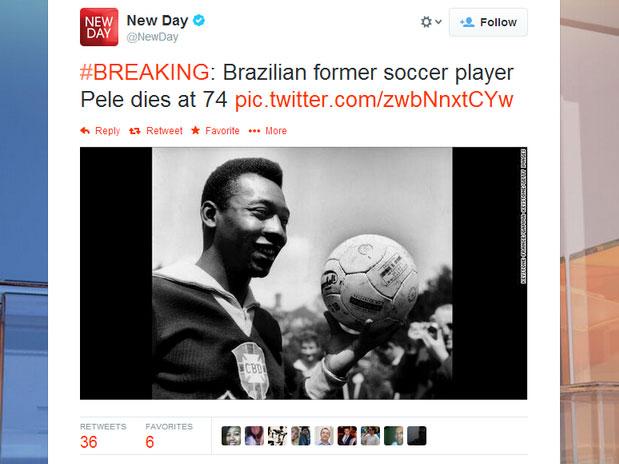 O perfil de um programa da CNN no Twitter anunciou nesta sexta-feira a morte de Pelé, notícia que foi desmentida instantes depois. Após algumas horas, o próprio rei do futebol se pronunciou sobre o tema. Em entrevista à Rádio Bandeirantes, o astro riu da situação e tranquilizou seus fãs sobre sua saúde.