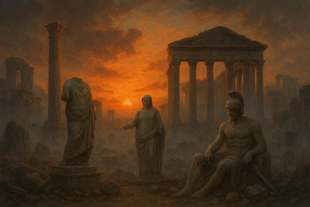 Nenhum trovão anunciou o fim. Roma, que um dia falara em nome dos deuses e dominara o mundo sob sua bênção, caiu em silêncio. As colunas dos templos racharam, as estátuas foram mutiladas e os sacerdotes desapareceram. Era como se as divindades que ergueram o Império tivessem voltado o rosto — ou simplesmente se calado para sempre.