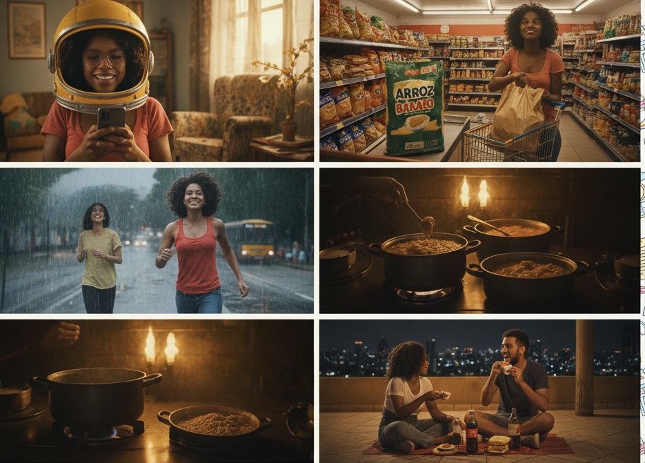 Primeira missão: supermercado. Você entra parecendo agente secreto: cabelo solto óculos escuros (de grau quebrado) e carrinho pequeno pra ninguém perceber a operação “sobrevivência”. Lista na cabeça: arroz (o mais barato que não tiver bicho), feijão (carioca, porque o preto agora é artigo de luxo), ovo (trinta ovos = quinze bifes na matemática da fome). Carne? Só se o açougueiro estiver de bom humor e jogar um ossinho “pra dar gosto”. Você agradece como se fosse filé mignon.