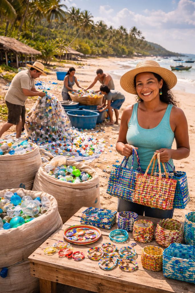 Garrafas, tampas e embalagens descartadas são recolhidas por voluntários e pescadores locais durante mutirões de limpeza ambiental. Depois de separados e higienizados, esses materiais são utilizados para a produção de objetos como bolsas, peças de decoração, brinquedos e até mobiliário simples. A iniciativa tem ajudado a reduzir a quantidade de lixo que chega ao mar.