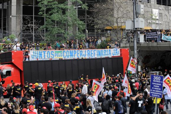 Um ato em frente à sede da Petrobras reuniu centenas de pessoas, nesta segunda-feira (24), para reivindicar a conclusão das obras de uma refinaria da estatal, onde originalmente havia sido projetado o Complexo Petroquímico do Rio de Janeiro (Comperj). Os manifestantes também pediram a volta de encomendas da companhia a estaleiros do Rio e de Niterói.