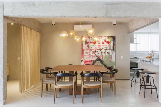 Na nova disposição de ambientes, um dos quartos foi transformado em escritório, separado da sala de jantar por ripas de madeira clara, uma solução que além de deixar tudo integrado, trouxe leveza à sala de jantar, equipada com lâmpadas de luz amarelada para que o clima seja o mais convidativo possível. Na parede, uma obra colorida dá o tom descontraído que a arquiteta buscava. “No fim das contas, todas as escolhas foram feitas em torno das paredes de concreto, desde as obras de arte, os móveis até a iluminação. Não tem como ser diferente, o concreto é algo simples, mas tem o poder de atrair nosso olhar.”