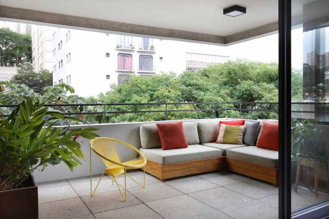 Nesta sacada sem churrasqueira e fechada com vidro, a arquitera desenhou um sofá em “L” em madeira de demolição e almofadões. O piso, em placa cimentícia, deixou o ambiente mais frio. Para aquecer o espaço, foi usado madeira e tons neutros, além de uma grande jardineira em aço. A ideia de Lúcia foi levar conforto ao espaço que é mais usado no verão sem comprometer o seu uso em épocas mais frias.