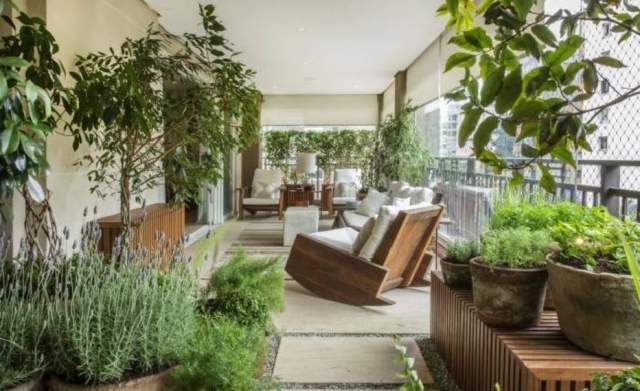Já nos vasos cerâmicos, foram usadas algumas frutíferas como jabuticabeira e pitangueira. E como a varanda conta ainda com um espaço gourmet e Paula gosta muito de cozinhar, foram plantadas as mais variadas espécies de temperos: hortelã, alecrim, salsa, coentro, tomilho, pimenta, manjericão e muitos outros.