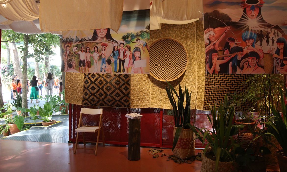 Para ler com calma, há uma biblioteca com 300 de títulos, e bancos artesanais feitos em formato de animais. A construção do espaço buscou obras exclusivamente de autores indígenas, apesar que parte dos livros de não ficção contam com coautores que não fazem parte dos povos tradicionais. Há ainda entrevistas e dicionários de línguas faladas no Brasil.