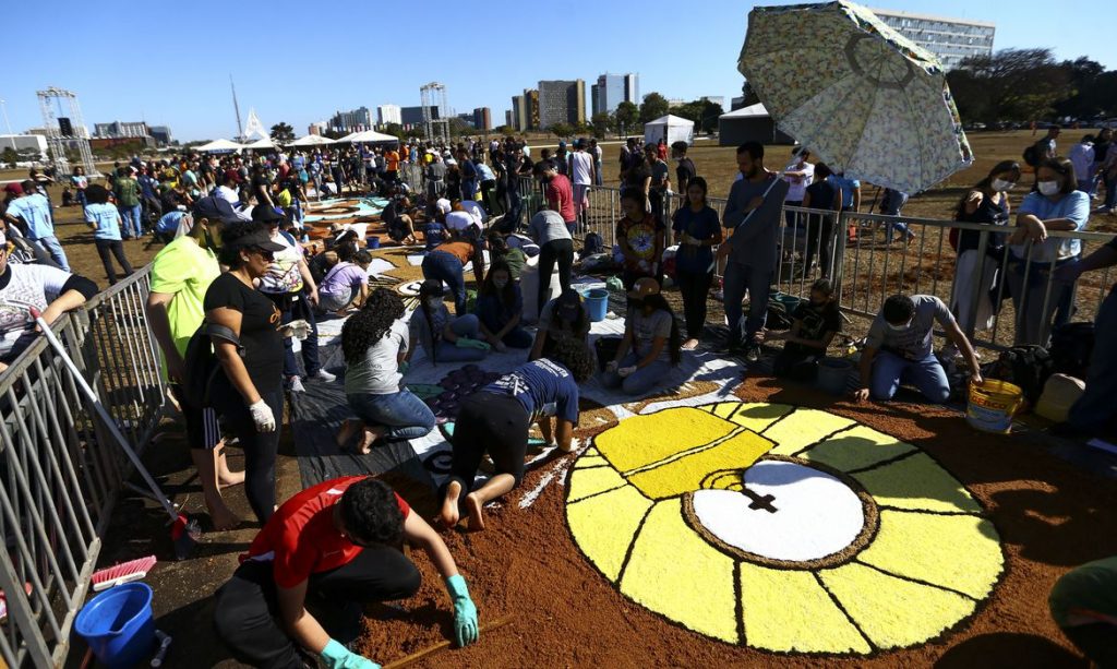 A tradicional festa católica do Corpus Christi na Esplanada dos Ministérios voltou na quinta, 16. Após um hiato de dois anos, devido às restrições impostas pela pandemia de covid-19, as paróquias do Distrito Federal voltaram a confeccionar os tapetes feitos de serragem no gramado em frente aos ministérios.