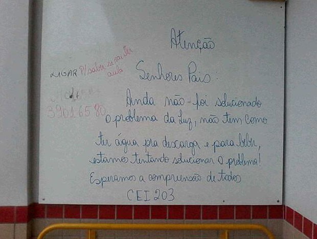 “Atenção, senhores pais: ainda não foi solucionado o problema da luz. Não tem como ter água para descarga e para beber. Estamos tentando solucionar o problema! Esperamos a compreensão de todos”, dizia o recado.