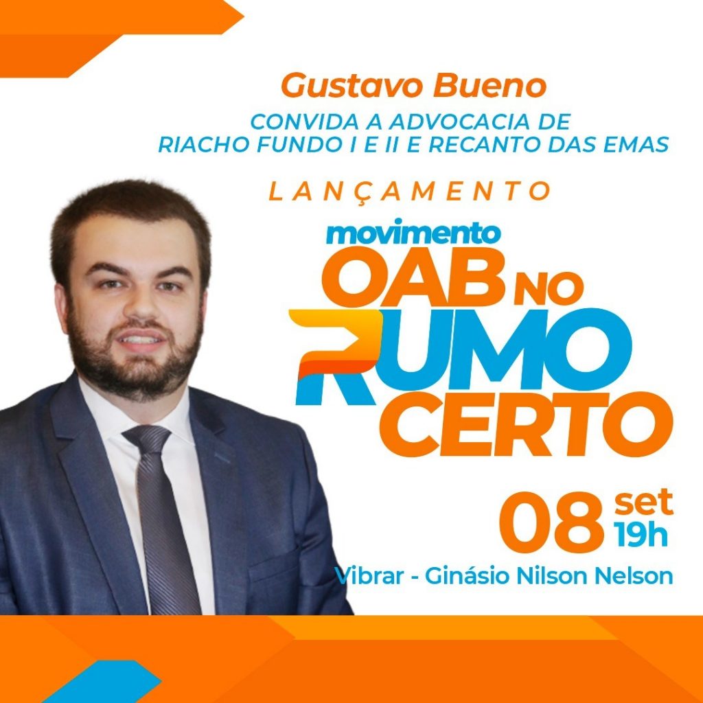 Fica cada vez mais encorpada uma eventual candidatura à reeleição de Délio Lins e Silva Jr para o comando da Seccional Distrito Federal da OAB. De todas as subseções partem convites chamando para o lançamento do movimento OAB No Rumo Certo. Um dos exemplos vem do advogado Gustavo Bueno, presidente da Ordem no Riacho Fundo. “Estamos convidando todo mundo (porque Délio) democratizou a Ordem para todos os advogados e advogadas”, diz Bueno em postagem nas redes socais. O evento será na quarta, 8, no Vibrar, ao lado do Nilson Nelson, a partir das 19 horas.