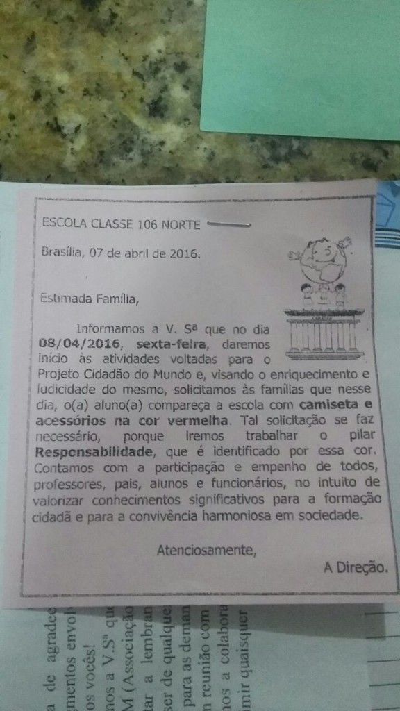 A diretora disse que chegou a receber uma ligação acusando-a de ser comunista e ameaçando-a. Na semana passada, a Escola Classe 106 Norte, localizada no Plano Piloto da cidade, pediu que os pais vestissem os alunos com “camisetas e/ou assessórios” vermelhos, para uma atividade na última sexta-feira (8), como parte do projeto Cidadão do Mundo. Segundo a vice-diretora, Lisete Prediger, o uso da cor vermelha significava um “alerta” para o combate à dengue.
