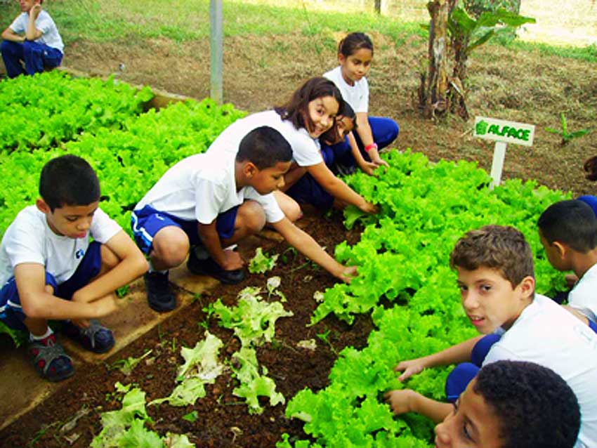 Em um trabalho capitaneado por três funcionários da escola, os alunos plantam, cuidam, regam e colhem de tudo. Hortaliças como alface (lisa, americana e roxa), escarola, almeirão, espinafre, cenoura, beterraba e pepino crescem, viçosas, em um trabalho totalmente orgânico e sustentável. “Até o processo de irrigação é ecologicamente correto. Temos cisternas que coletam água da chuva”, conta a diretora da unidade, Daniele Gutierres. O pomar ostenta 450 árvores, com 72 variedades de frutas. Manga de quatro tipos, laranja de outros quatro, acerola, caju, romã, pêssego, goiaba e um parreiral que começa a dar os primeiros frutos. É a natureza contra a fome.