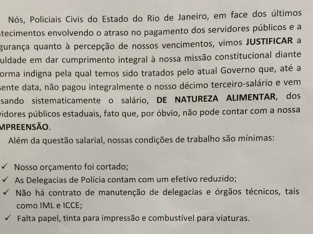 A população receberá nas delegacias que aderirem à paralisação um documento que justifica a dificuldade da unidade em dar cumprimento aos procedimentos, explica a situação passada pela categoria e presta conta dos serviços realizados em 2015.