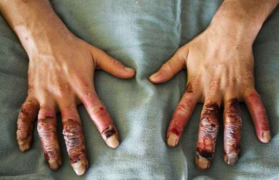 Em seus estágios iniciais estas queimaduras apresentam ulcerações superficiais, seguidas de inchaços e frequentemente com a presença de bolhas, como queimaduras típicas por objetos quentes. Neste caso, é necessário cobrir e aquecer o mais rapidamente possível a área afetada e procurar ajuda médica.