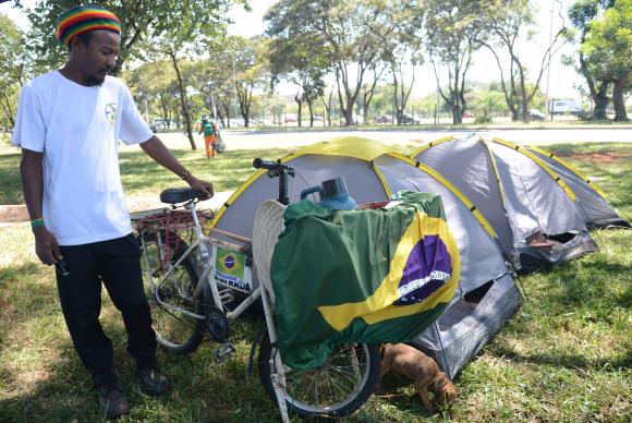 “Botei na cabeça que Brasília era o lugar para vir”, disse ele, ao lado de sua bicicleta, semelhante às usadas para fazer entregas de galões de água e sobre a qual montou uma espécie de cozinha móvel. Em uma placa fixada entre as barras do quadro, ele colou um adesivo de um palmo de largura em que se lê: “Impeachment já!”. Sobre o guidão, trouxe amarrada uma bandeira do Brasil.