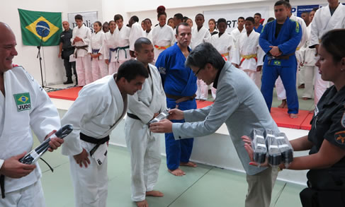 As Unidades de Polícia Pacificadora (UPPs) Fazendinha, no Complexo do Alemão, Providência, no Centro, Mangueira e Macacos, na Zona Norte, e os Batalhões de Polícia de Choque (BPChoque), 11º BPM (Nova Friburgo) e de Policiamento em Vias Especiais (BPVE) receberam do governo do Japão 80 tatames, 100 quimonos e 50 faixas de judô para alunos dos projetos de artes marciais das comunidades atendidas pelas unidades. A entrega aconteceu no último domingo (6), na sede da UPP Fazendinha, e teve a presença do coordenador de Polícia Pacificadora (CPP), coronel André Silva de Mendonça, de representantes dos consulados do Japão, Itália e Suíça no Rio de Janeiro e da Federação japonesa de judô.