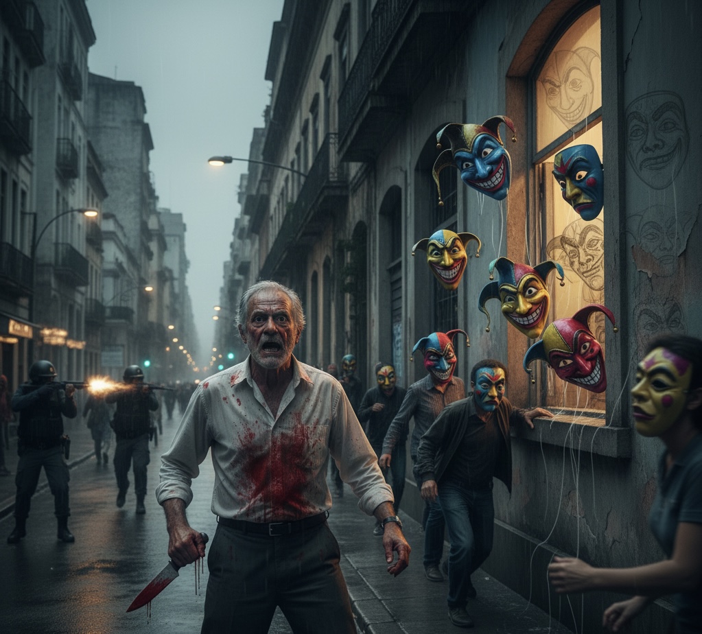Ele a matou com uma única facada. Coberto de sangue, correu pela rua, ferindo mascarados a esmo, até ser atingido por uma saraivada de tiros.