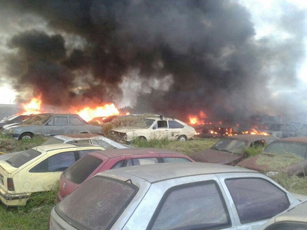 Um depósito onde são recolhidos carros apreendidos pelo Detran, em Ceilândia, pegou fogo na tarde desta quinta-feira (12). O local foi atingido por fogos de artifício disparados na abertura da Copa do Mundo.
